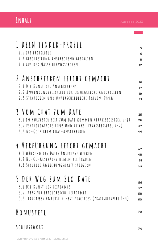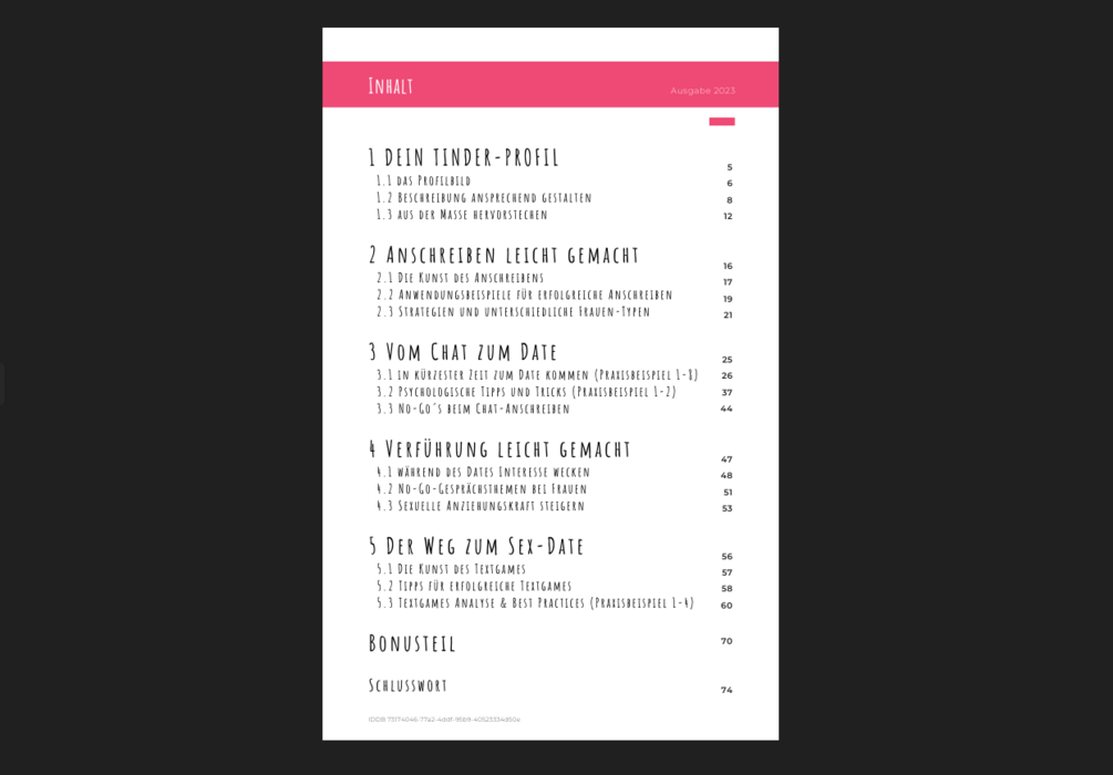 Es ist nicht einfach nur ein Ratgeber – es ist dein persönlicher Schlüssel zum Erfolg auf Tinder! Mit klaren Anleitungen, spannenden Praxisbeispielen und wertvollen Insights wirst du Frauen nicht nur anschreiben, sondern wirklich begeistern.